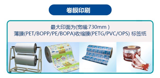 最大印面為(寬幅:730mm );薄膜(PET/BOPP/PE/BOPA);收縮膜(PETG/PVC/OPS);標簽紙……